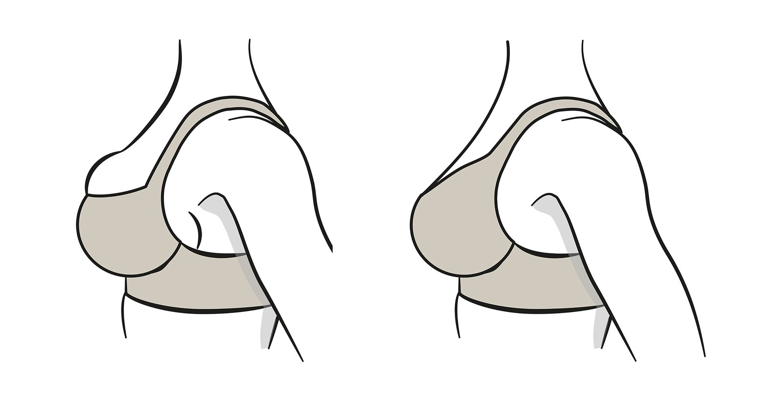 Als de beugel in het borstweefsel drukt, is de cup te klein. De beugel moet aan de zijkant voorbij uw borst zitten, niet op de borst zelf. Ga een of meer cupmaten omhoog, maar houd de gebruikelijke omtrek van uw behaband aan.